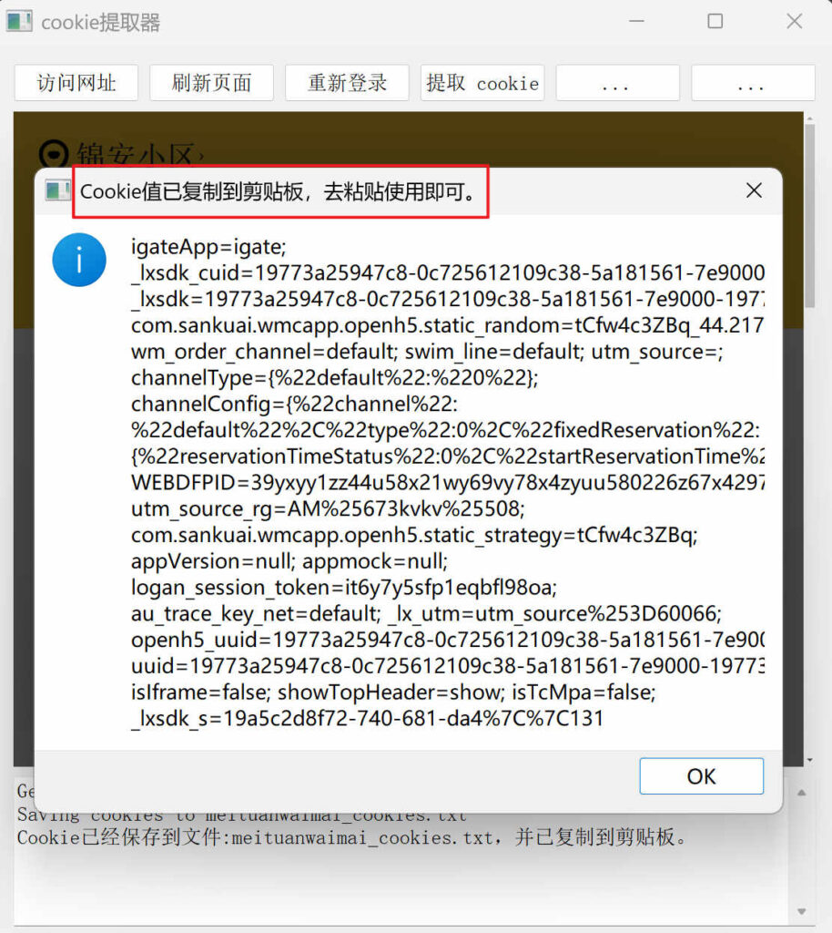 会提示cookie已经自动复制到剪贴板,去粘贴使用即可。且cookie值也同步保存到工具目录下的:meituanwaimai_cookies.txt,用户可依需使用。