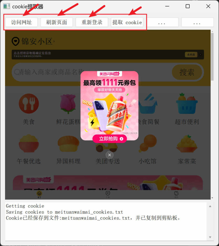 访问网址、刷新页面、重新登录、提取cookie四个按钮。工具默认打开美团外卖首页,直接加载。