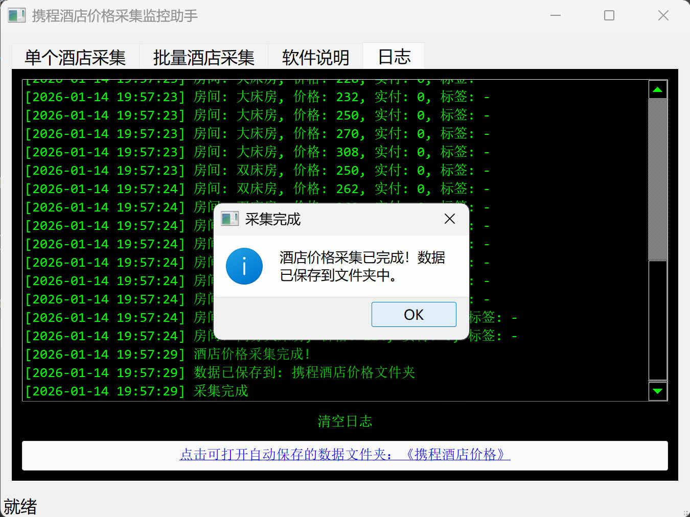 📊 自动导出: 采集完成后,所有数据将自动导出为csv格式,便于您进行后续分析和对比。软件还会自动打开数据文件,让您第一时间查看房间价格信息,省时省力!