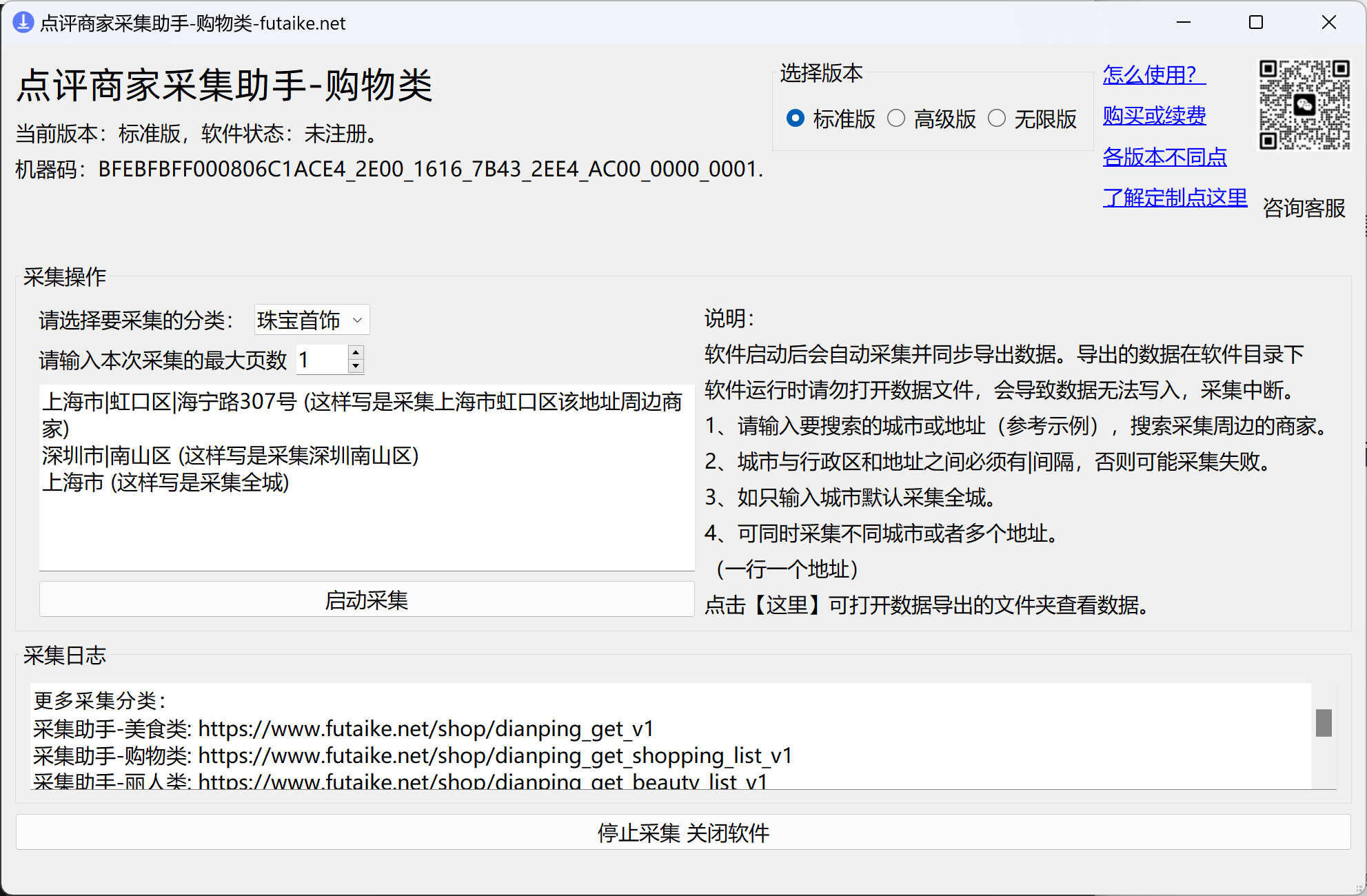 1、大众点评商家采集助手-购物类专用不同版本集成在一个使用界面当中,更方便使用不同版本的功能;